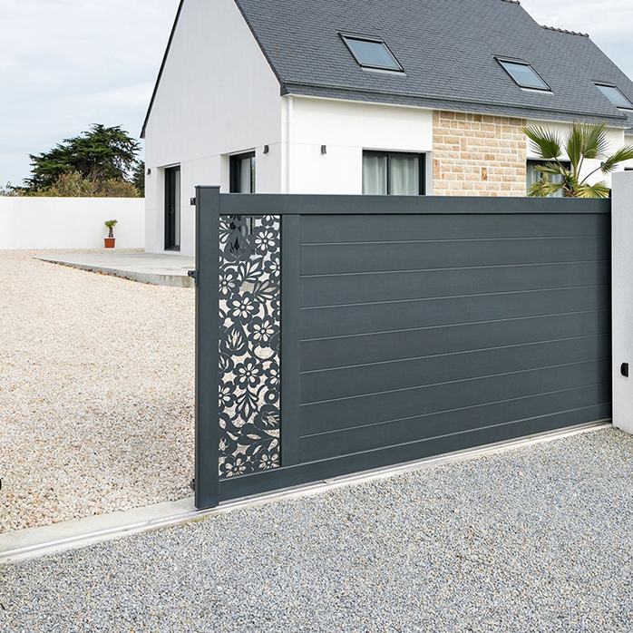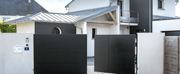 Los portones abatientes pueden abrirse hacia el interior de la propiedad (empujando) o hacia el exterior (tirando). Esta puerta se puede automatizar.